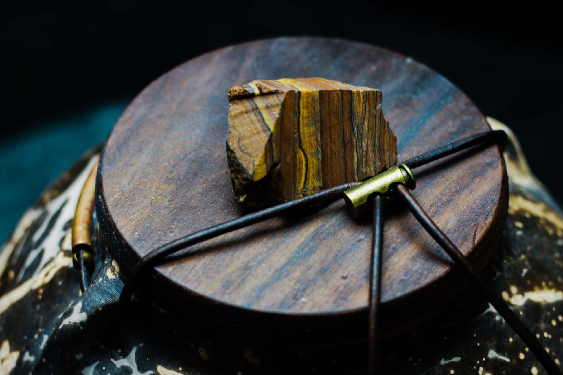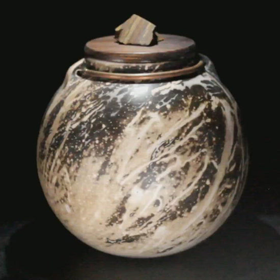This vessel is crowned with a hand-turned [Walnut / Butternut] lid, chosen for its warmth and grain to complement the ceramic surface. Anchoring the lid is a raw [Insert Gemstone Name, e.g., Black Tourmaline] finial, selected to ground the piece and add a final touch of geological intent. A leather cord with a secure tie ensures the contents remain undisturbed.